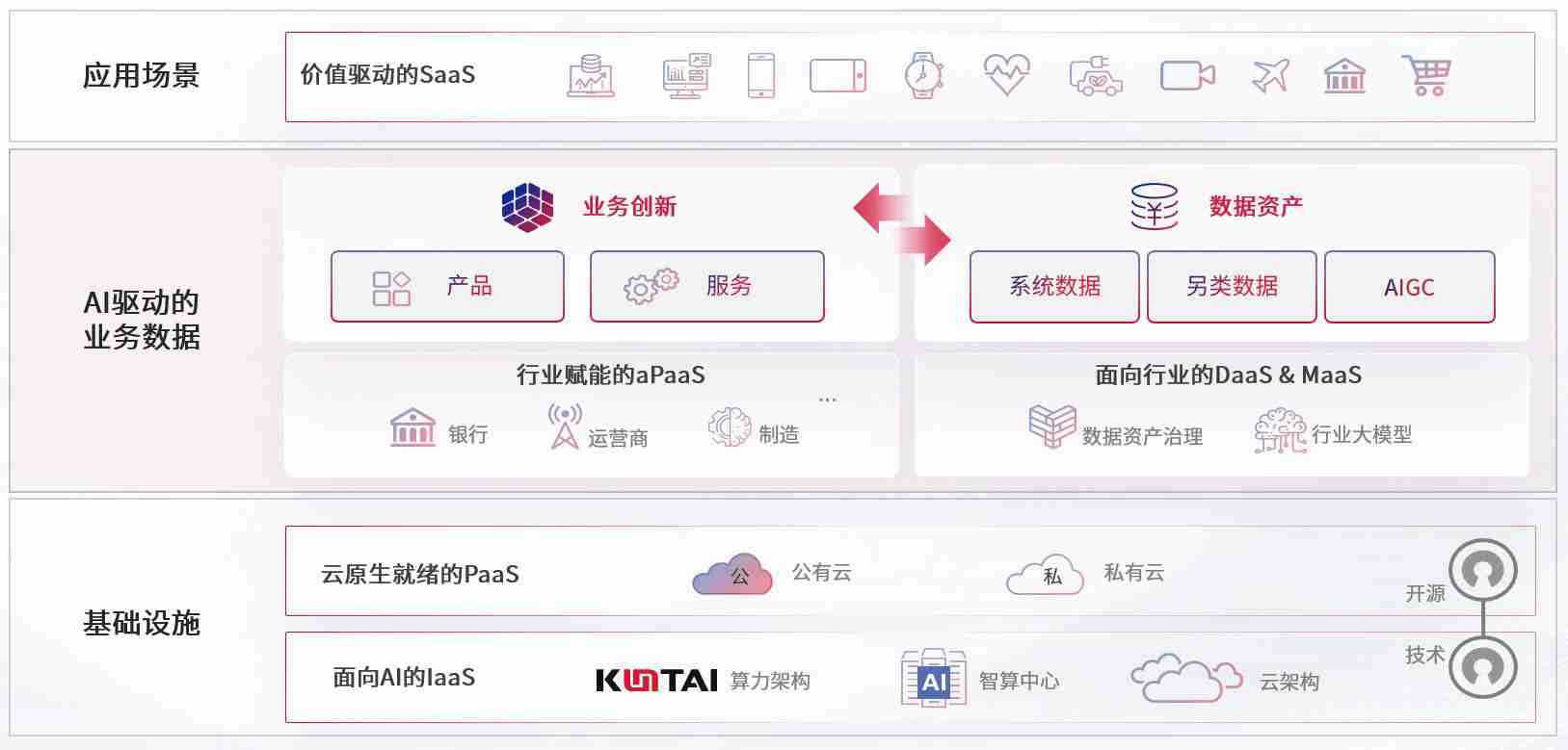 数字时代,,围绕企业数字化转型的关键要素,,,,壹号娱乐数码开创性的提出数云融合战略和技术体系框架,,,,着力在云原生、、数字原生、、、、AI原生和信创产业上架构产品和服务能力,,为处在不同数字化转型阶段的快消零售、、、、汽车、、、、金融、、医疗、、、政企、、教育、、、、运营商等行业客户提供泛在的敏捷IT能力和融合的数据驱动能力,,,构建跨界融合创新的数字业务场景和新业务模式,,,,助力企业级客户建立面向未来的核心能力和竞争优势,,,全面推动社会的数字化、、智能化转型升级。。