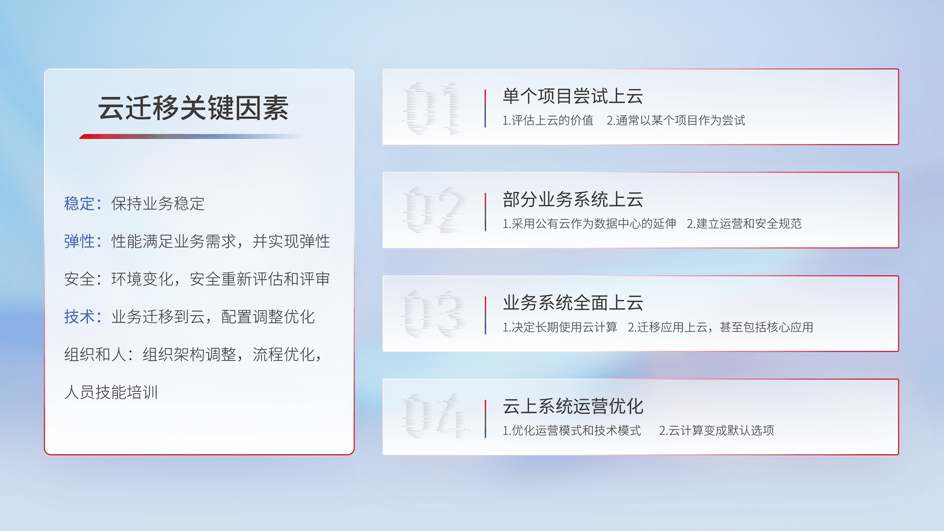 结合实际业务,,,,从规划设计、、、、云平台选型、、、云原生改造、、、数据迁移、、、集成交付,,,迁移全过程为客户识别最佳上云路径,,做好风险识别管理,,,设计网络架构、、、、身份权限、、安全审计合规、、、、操作审计、、、、日志审计、、监控告警策略、、多站点容灾设计等,,,对云上基础设施进行整体规划,,,,提升IT治理水平,,,,以满足弹性、、、高可用、、高性能的需求。。。。