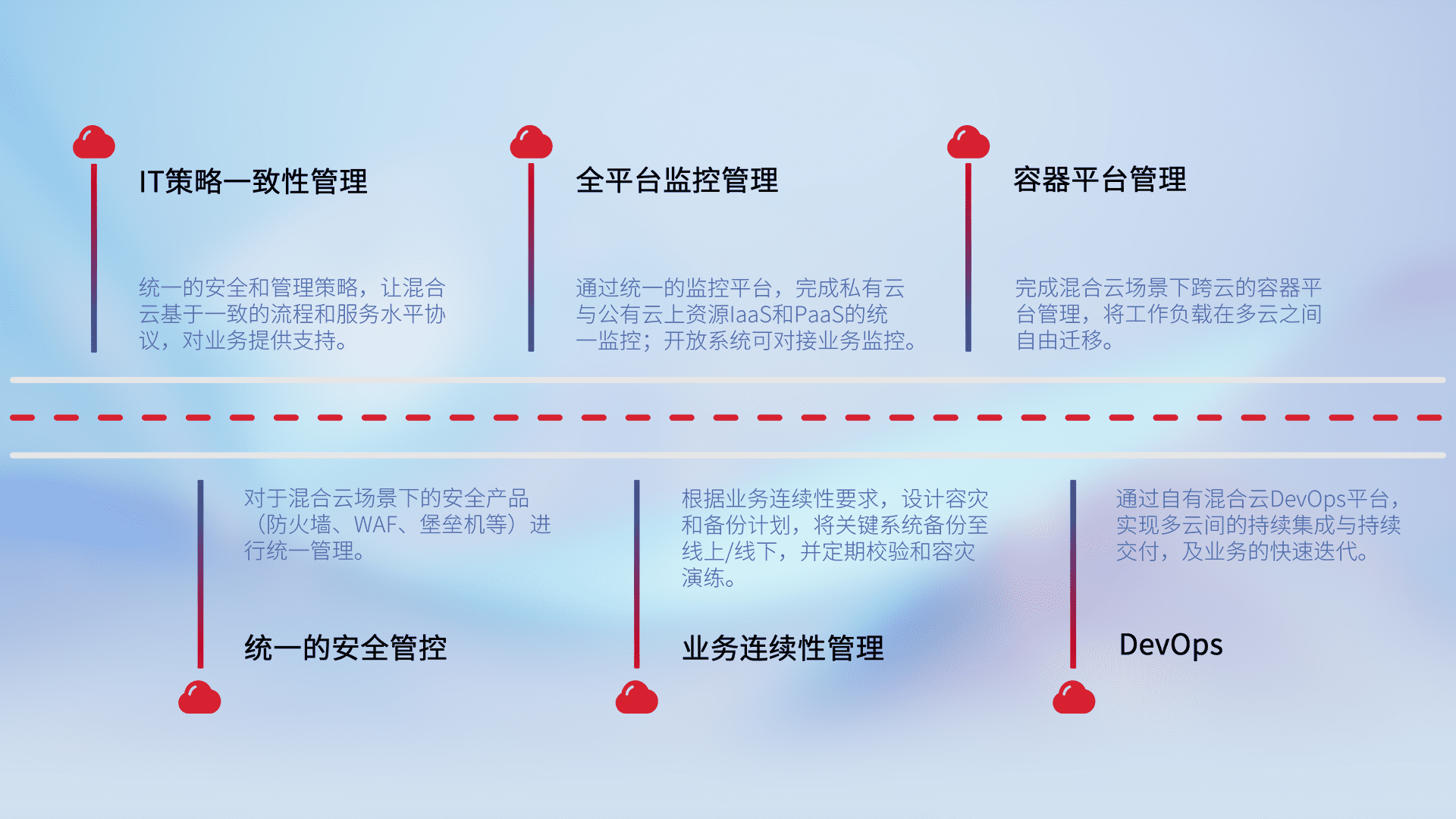 通过多云纳管,,,,以统一的资源数据模型把客户的云资源进行抽象和封装,,,,进而实现对多云资源的统一操作,,,,保障云资源管理的可靠性、、稳定性与可用性。。。。量身定制化运维内容,,配置、、开发运维、、、补丁管理、、备份、、监控、、、、认证和访问管理、、、、审计和日常巡检等,,保障在用云过程中的可靠度,,稳定度以及高可用率。。
